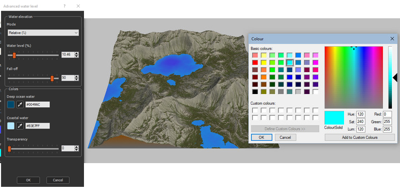 | Relative % | Sets the water elevation as a percentage of the terrain elevation. |