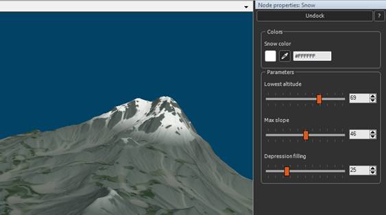 The Snow node applies a snow color map to a terrain at locations defined by parameters.