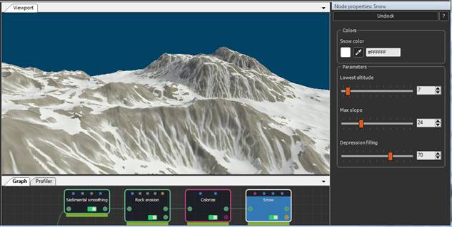 Tip: Place it after a Colorize or Advanced Colorize node to achieve the desired color for rocks and sediments. The results are interesting if we have sedimental smoothing and rock erosion: they will smooth the ground and add sediment at the bottom of the slopes to give a snow accumulation effect.