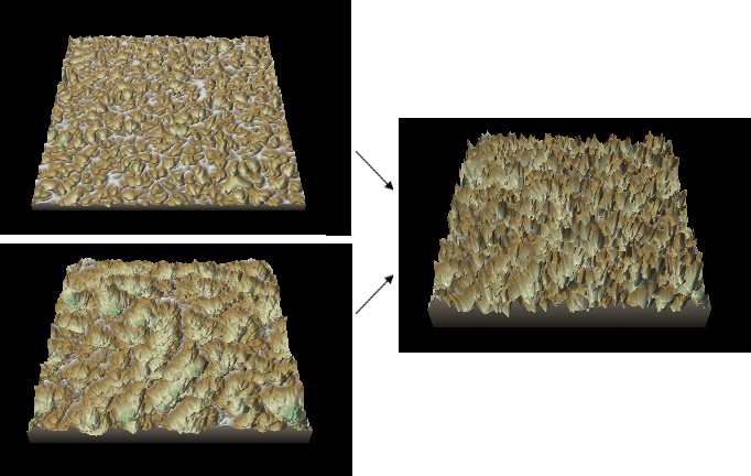 If both input terrains do not have the same size or resolution, the size and resolution of the output terrain is determined by the size and resolution of the first terrain and the second terrain is enlarged or decreased so that its size corresponds exactly to the size of the output terrain, before being multiplied with the first terrain.