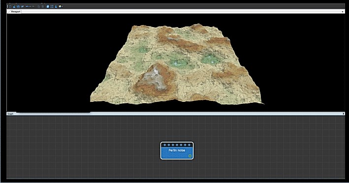 This node creates a terrain using a Perlin noise generator, one of the generators most frequently used to create a terrain.