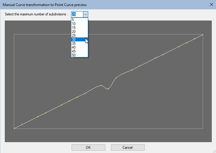 curveOnce you have edited your curve, you can switch from the Manual mode to the Point mode to add control points. The control points are displayed in increasing subdivisions of five, from 5 to 50 points. A higher number of control points gives you more control over the changes you make to the curve.
