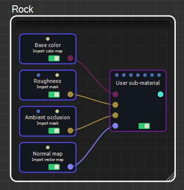 The User sub-material node allows you to create a new sub-material, generally from imported textures: